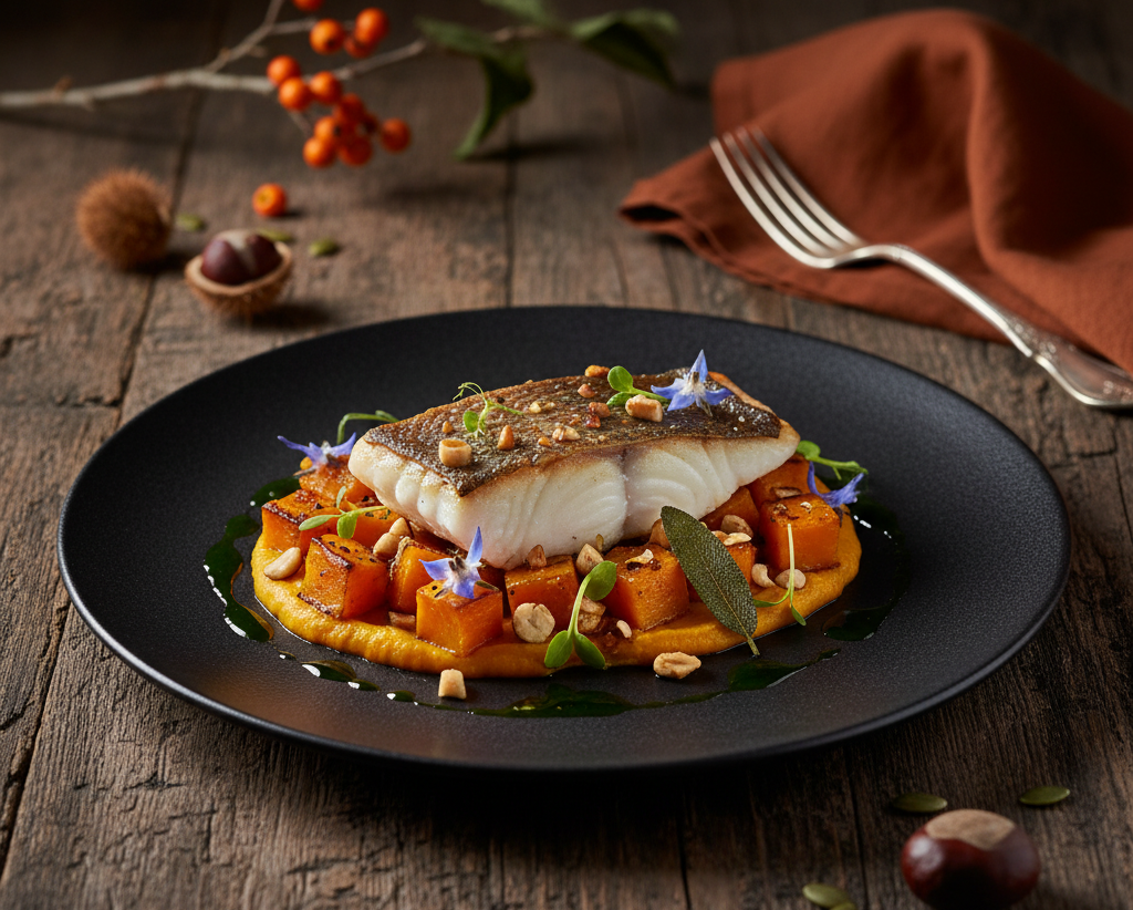 - Ajoutez le bar sur les dés de potiron, assaisonnez avec le sel, le poivre et les herbes de Provence.