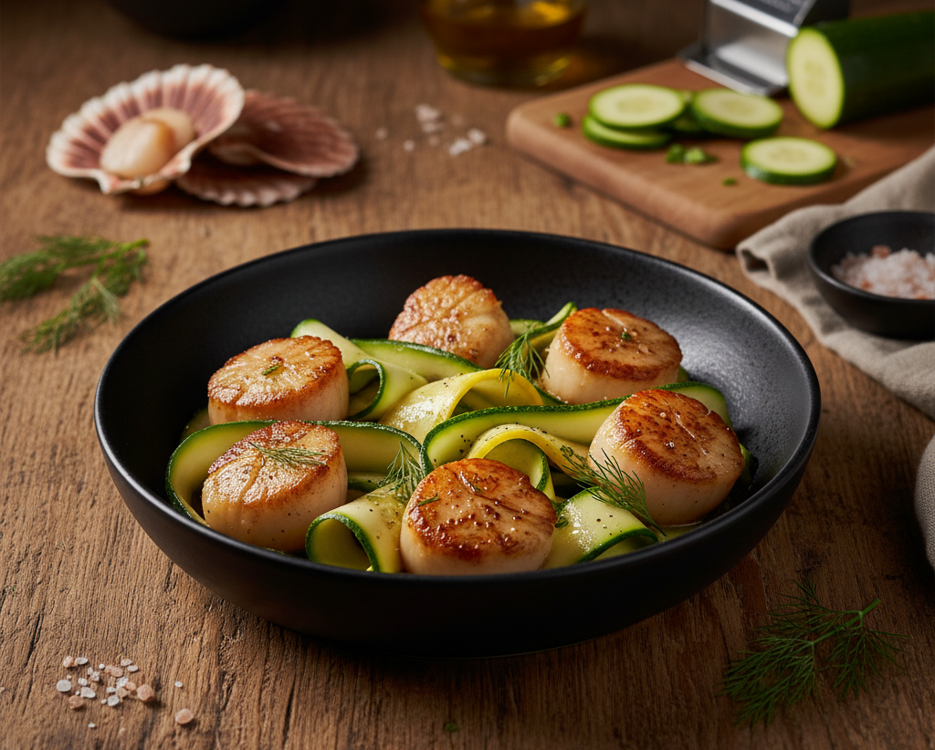Savourez ce plat raffiné de Saint-Jacques aux courgettes, où la douceur des coquilles s’allie à la légère amertume des courgettes. Cette recette met en avant la finesse des ingrédients, idéale pour une occasion spéciale ou un dîner en tête-à-tête. Les Saint-Jacques apportent des protéines maigres et des oméga-3, tandis que les courgettes ajoutent des fibres et des vitamines. Grâce au Cookeo, la préparation est simplifiée : en un rien de temps, vous pourrez réaliser ce plat succulent avec une cuisson parfaitement maîtrisée, tout en préservant la texture délicate des Saint-Jacques. Un vrai régal qui impressionnera vos invités !