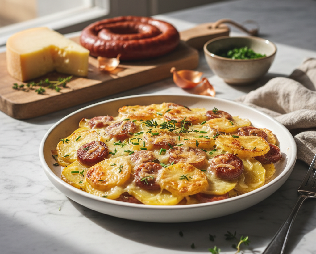 - Alterner une couche de pommes de terre, lardons et oignons.