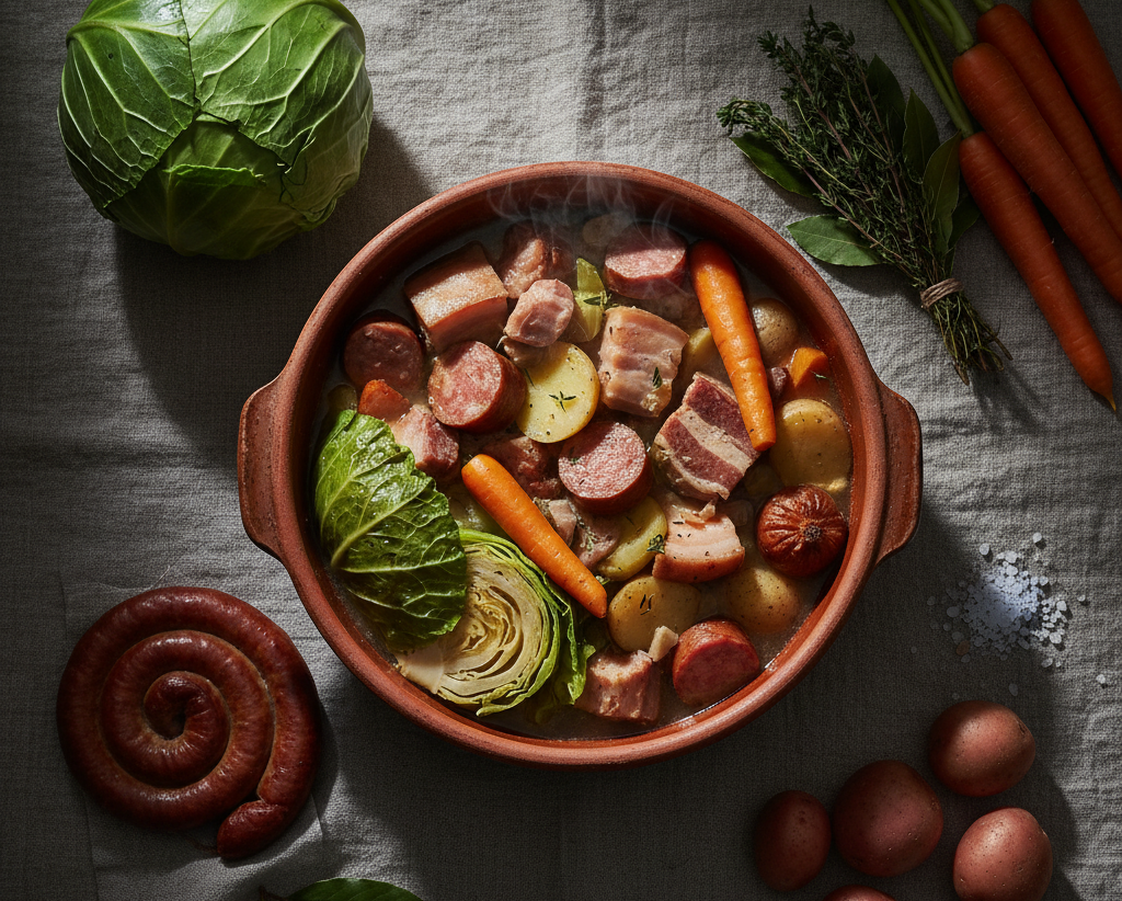 - Faire dorer les saucisses de Montbéliard et les lardons.